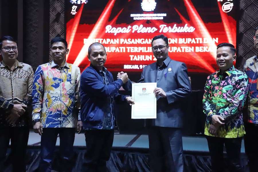 “Menetapkan pasangan calon Nomor Urut 3 Ade Kuswara Kunang SH dan dr Asep Surya Atmaja dengan perolehan suara sebanyak 666.494 atau 45,68 persen, sebagai pasangan calon Bupati dan Wakil Bupati terpilih Kabupaten Bekasi, periode 2025-2030,” kata Ketua KPU Kabupaten Bekasi Ali Rido.