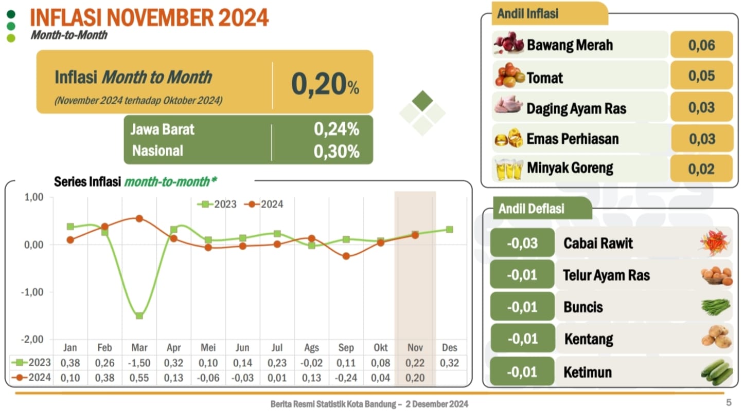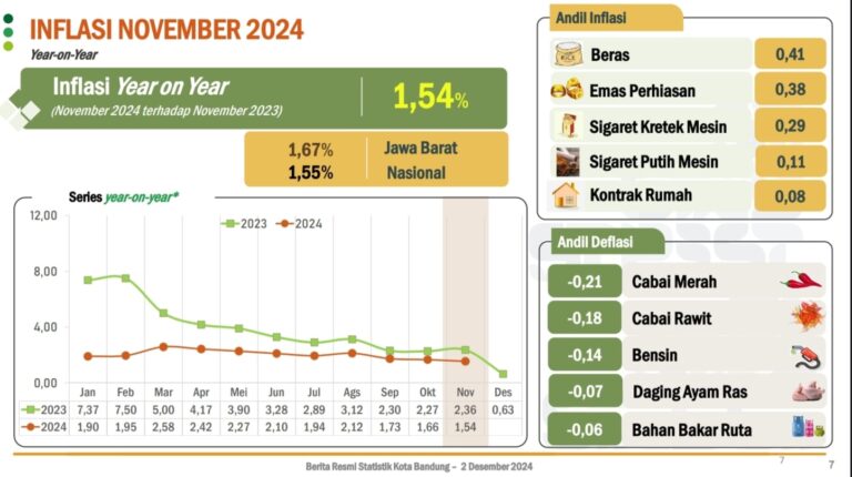 Breakingnewsjabar.com – BPS Kota Bandung merilis data inflasi November 2024. Hasilnya, Kota Bandung mencatat inflasi sebesar 0,20 persen (month-to-month) pada November 2024, berada di bawah rata-rata nasional yang mencapai 0,30 persen.