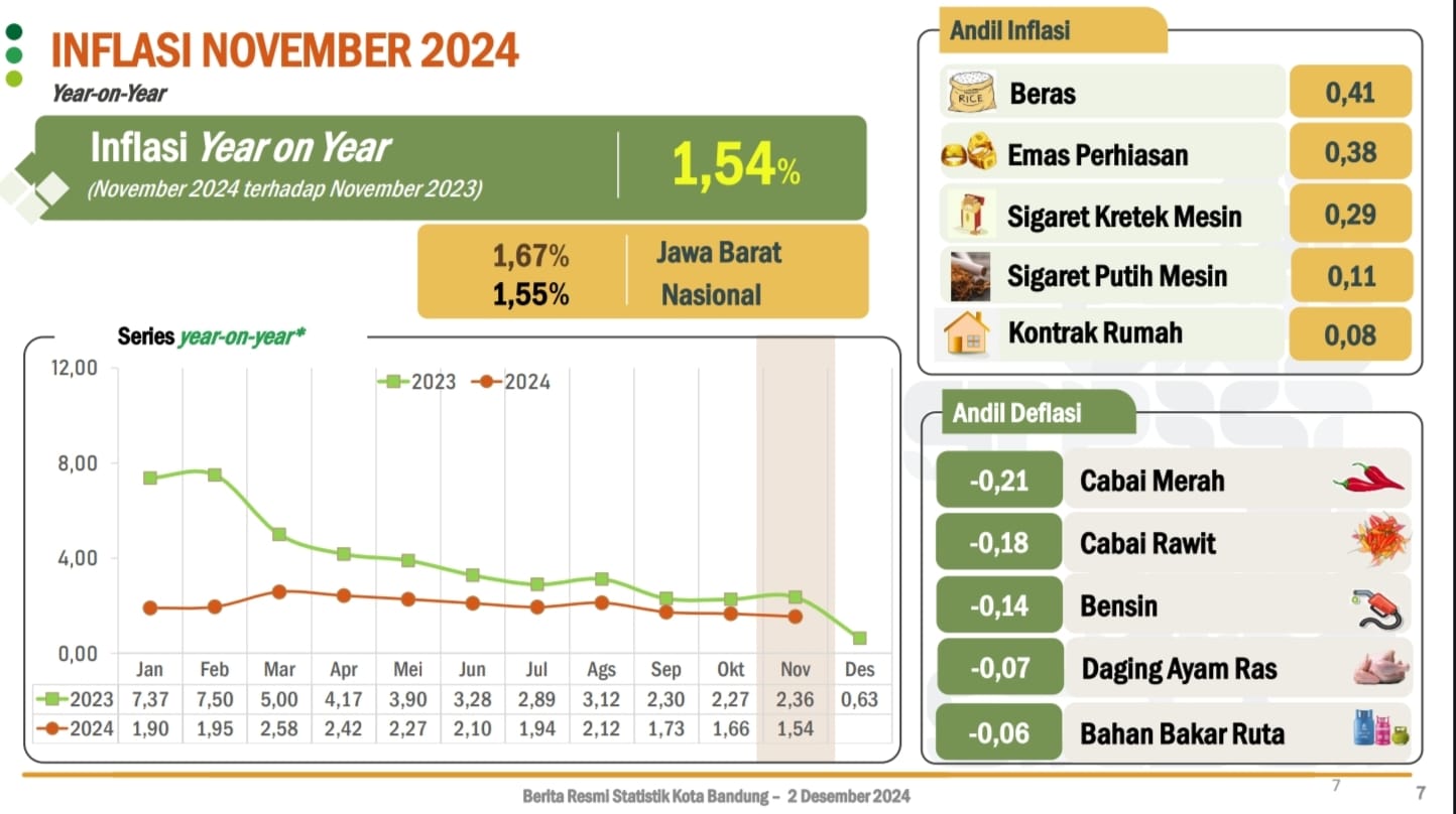 Secara year-to-date, inflasi Kota Bandung tercatat sebesar 1,21 persen. Ini menjadikannya sebagai salah satu yang terendah di Jawa Barat. Sementara itu, inflasi year-on-year mencapai 1,54 persen, sedikit lebih rendah dibandingkan rata-rata nasional yang berada di angka 1,55 persen.