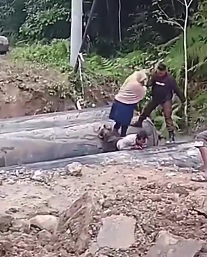 Bripka Syahid rela badannya diinjak oleh seorang ibu dan anaknya saat ingin melintasi jalan yang terputus akibat bencana longsor di Kecamatan Sengkongkang, Sumbawa Barat, Nusa Tenggara Barat.