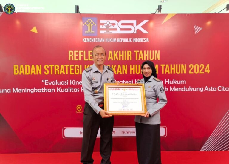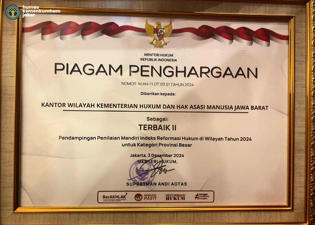 Breakingnewsjabar.com – BANDUNG | Kanwil Kemenkumham Jabar dapatkan Predikat Terbaik II dalam Program Pendampingan Penilaian Mandiri Indeks Reformasi Hukum (IRH) secara Nasional untuk Kategori Kanwil  Besar di Indonesia. Hal ini diberikan langsung oleh Menteri Hukum Supratman Andi Agtas dalam acara Pembukaan Refleksi Akhir Tahun Badan Strategi Kebijakan Kementerian Hukum di Jakarta, (Selasa, 03/12/2024) .