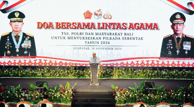 Breakingnewsjabar.com – Denpasar | Ribuan orang memadati GOR Yudomo, Praja Raksaka Kepaon, Denpasar, dalam sebuah acara bersejarah: Doa Lintas Agama bersama TNI-Polri dan masyarakat Bali. Kegiatan yang penuh makna ini menjadi simbol persatuan dan toleransi, sekaligus ikhtiar bersama untuk menyukseskan Pilkada Serentak 2024 dengan aman dan damai.