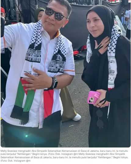 Breakingnewsjabar.com – JAKARTA | Melly Goeslaw , artis sekaligus politisi dari Partai Gerindra , hadir dalam acara Aksi Simpatik untuk Menyelamatkan Kemanusiaan di Gaza , yang digelar di Jakarta. Acara ini diinisiasi oleh Ketua Badan Kerja Sama Antar Parlemen DPR RI, Mardani Ali Sera , sebagai bentuk solidaritas terhadap penderitaan rakyat Palestina .