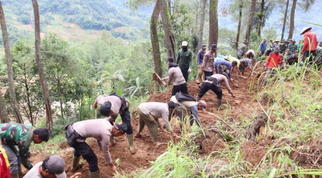 Dari pantauan tim Tribratanews Polres Pekalongan di lokasi, TNI-Polri bersama warga melaksanakan pembersihan material longsor guna membuka akses jalan.