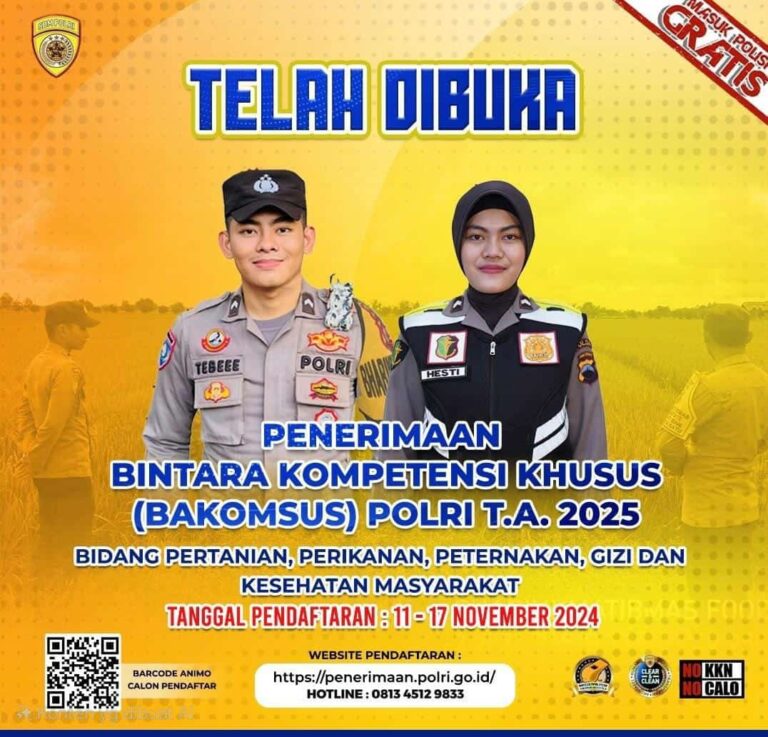 Breakingnewsjabar.com – Polri kembali membuka kesempatan bagi putra dan putri terbaik bangsa untuk bergabung melalui penerimaan Bintara Kompetensi Khusus (Bakomsus) Tahun Ajaran 2025. Pendaftaran ini dibuka mulai tanggal 11 hingga 17 November 2024 dan memberikan peluang khusus bagi calon pendaftar yang memiliki latar belakang di bidang pertanian, perikanan, peternakan, gizi, dan kesehatan masyarakat.