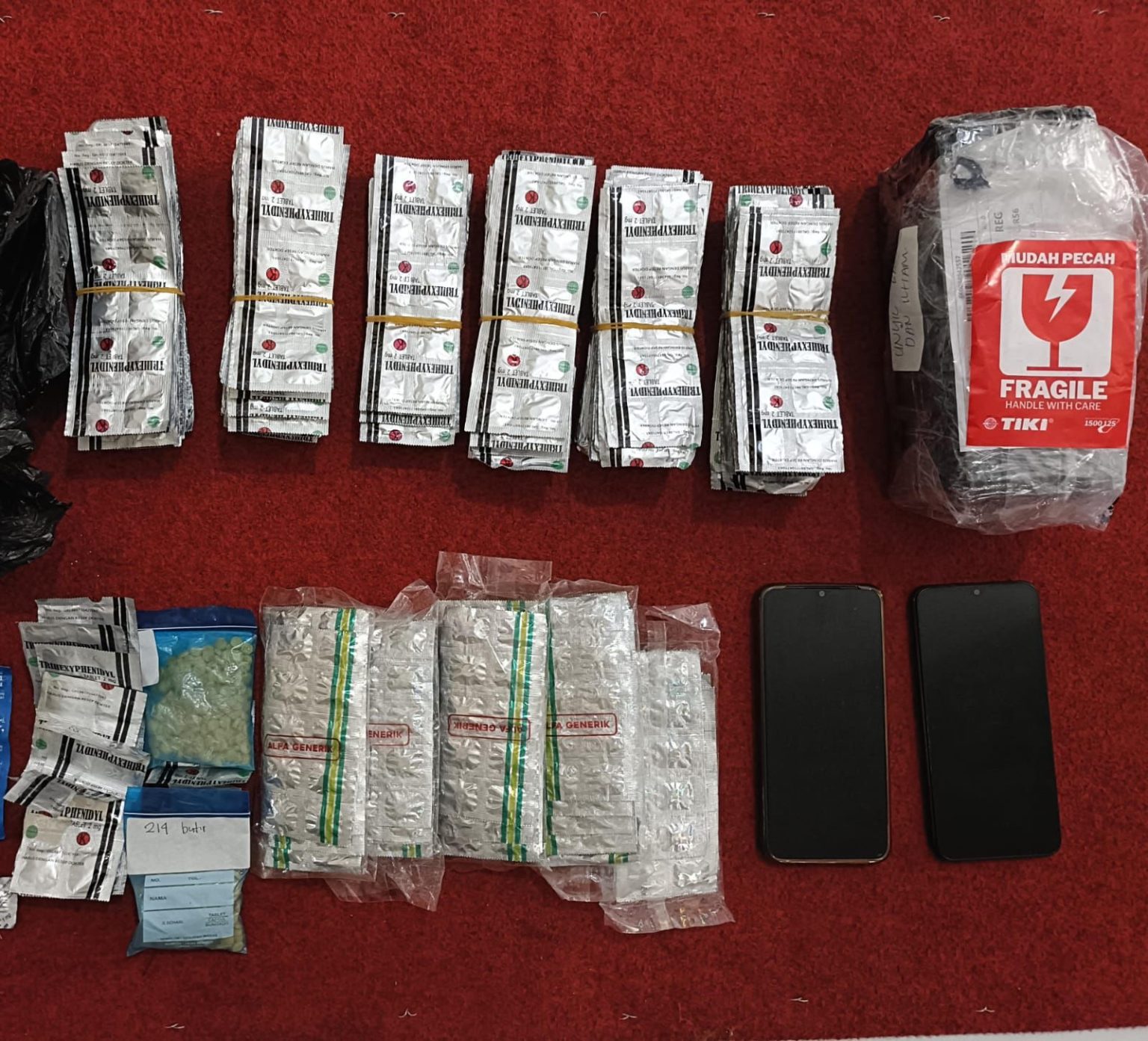 Saat ditangkap, petugas berhasil mengamankan barang bukti berupa sebuah kantong kresek warna hitam yang berisi 1.500 butir Tramadol, 1.577 butil Trihexphenidyl, dan 404 butir Hexymer. Selain itu, handphone milik kedua pelaku juga ikut diamankan sebagai barang bukti.