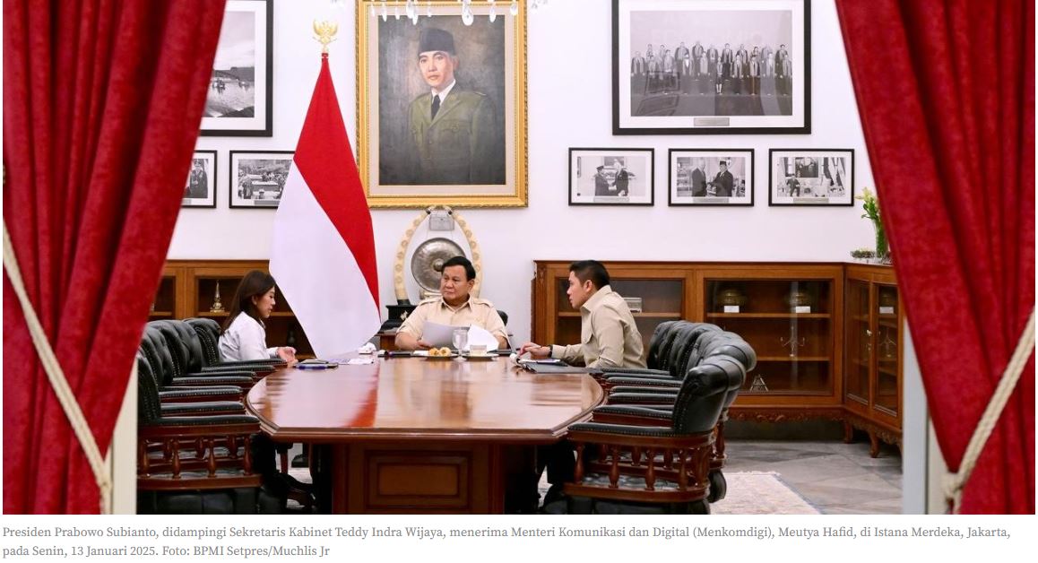 Breakingnewsjabar.com – JAKARTA | Presiden Prabowo Subianto, menerima Menteri Komunikasi dan Digital (Menkomdigi), Meutya Hafid, di Istana Merdeka, Jakarta, pada Senin, 13 Januari 2025. Pertemuan tersebut membahas program-program strategis Kementerian Komdigi, terutama terkait transformasi digital dan penerapan e-government di berbagai sektor layanan publik.