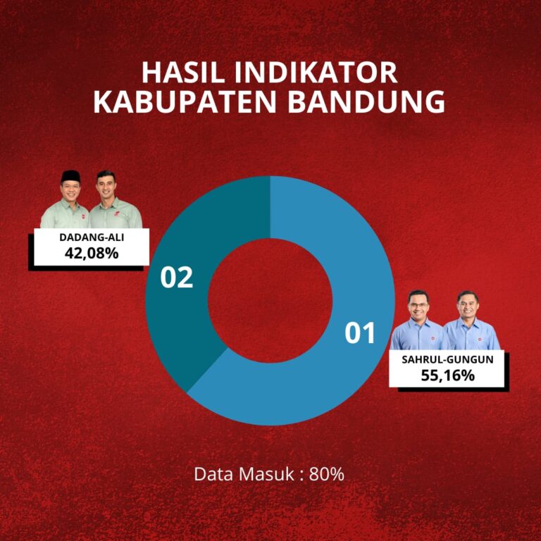 Breakingnewsjabar.com – KABUPATEN BANDUNG | Survei Indikator merilis hasil quick count Pilbup Bandung 2024 yang menunjukkan pasangan Calon Bupati-Wakil Bupati (Cabup-cawabup) Bandung, Sahrul Gunawan-Gun Gun Gunawan, unggul dengan perolehan suara sebesar 55,16 persen. Sedangkan rivalnya, pasangan calon (paslon) Dadang Supriatna-Ali Syakieb memperoleh 48,08 suara.